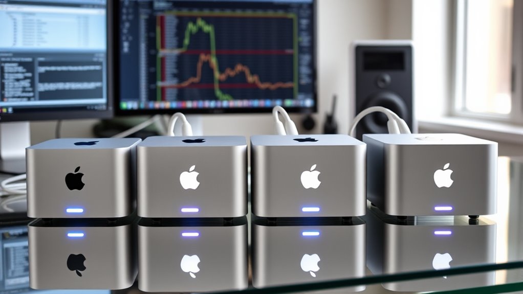 A Mac mini with 10Gb Ethernet provides a significant boost in network speed, but it’s important to contemplate the available connectivity options to maximize its potential. The dedicated 10Gb Ethernet port delivers high bandwidth for fast data transfers, ideal for professional workflows. Additionally, the presence of Thunderbolt 4, HDMI, and USB-C ports offers versatility, allowing me to connect multiple peripherals and displays seamlessly. Some models even support configurable Ethernet options, enabling an upgrade from Gigabit to 10Gb Ethernet if needed. This flexibility ensures I can optimize the Mac mini for various setups, whether for demanding data transfers or multimedia connections. Considering these port options helps me build a setup that’s not only fast but also adaptable to evolving connectivity needs in 2025.