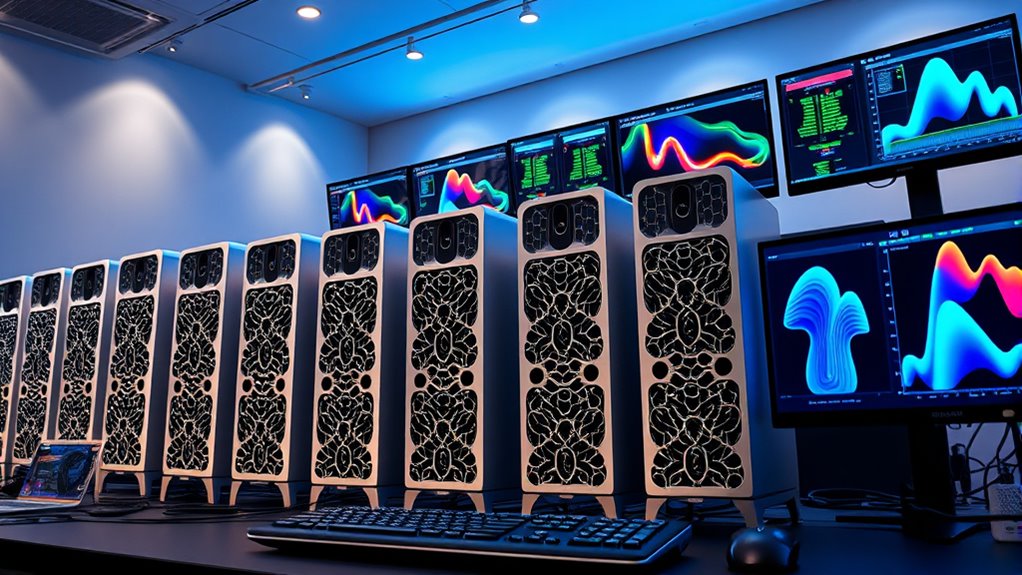External GPU options considerably boost my Mac Pro’s 3D rendering capabilities by providing extra graphics power beyond its built-in GPU. I connect a compatible eGPU via Thunderbolt, which accelerates rendering times and handles complex simulations more smoothly. This setup allows me to work on demanding projects efficiently, without needing a completely new system. It’s a flexible, cost-effective way to upgrade my Mac Pro’s performance for high-end 3D tasks.