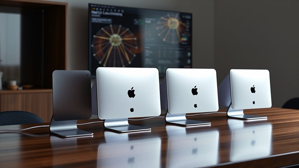 Processing power and the number of cores are essential factors when selecting a Mac Studio for machine learning. A higher core count allows the system to handle multiple tasks simultaneously, improving parallel processing capabilities necessary for large models. Mac Studios with a mix of performance and efficiency cores optimize both speed and power consumption, guaranteeing efficient workflow management. A more powerful CPU with more cores accelerates training and inference, especially for complex neural networks. Additionally, processors equipped with specialized media engines and hardware-accelerated ray tracing boost data preprocessing and visualization tasks. Combining multiple cores with high-bandwidth memory ensures rapid data transfer and processing, which is critical for large-scale machine learning models. Prioritizing processing power and core count helps maximize performance and reduce computation time.