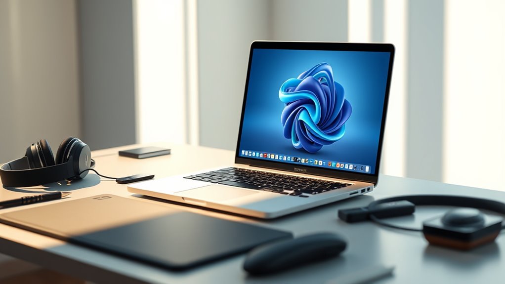 Choosing the right MacBook Pro for 3D modeling and VFX hinges on guaranteeing your software of choice runs smoothly on macOS. I always check that industry-standard tools like Blender, Maya, and Adobe After Effects are supported and fully compatible. Hardware acceleration features, such as hardware-accelerated ray tracing and media engines, are essential for efficient rendering and encoding, so I verify that the MacBook’s hardware supports these features. The GPU must meet minimum and recommended specs for real-time previews and smooth rendering. I also guarantee that plugins and add-ons work without issues, which sometimes requires specific OS or hardware support. In conclusion, I look for official support or optimized versions from software developers to guarantee stability and peak performance on my chosen MacBook Pro.