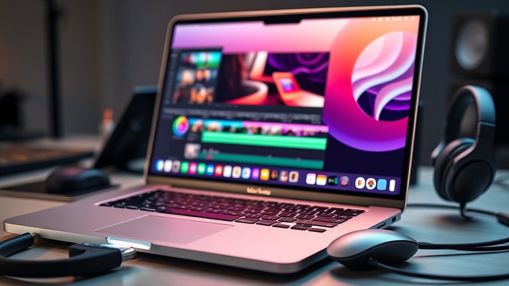 When selecting a MacBook Pro for video editing, paying attention to connectivity options is vital because they directly impact data transfer speeds and workflow efficiency. High-speed ports like Thunderbolt 4, Thunderbolt 5, and USB 4 support rapid data transfer, which is essential when working with large video files. An HDMI port capable of 8K or 4K at high refresh rates allows for seamless connection to high-resolution external displays, enhancing editing precision. The SDXC card slot offers quick, convenient access to footage from professional cameras. Support for MagSafe 3 ensures safe, reliable charging without sacrificing port availability. Additionally, a 3.5mm headphone jack supporting high-impedance headphones provides high-quality audio monitoring, vital for detailed editing work. These options collectively guarantee a smooth, efficient editing experience.