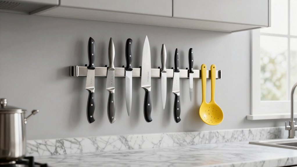 Selecting the right mounting method for your magnetic knife strip depends on your wall type and personal preferences. Adhesive mounting is quick and damage-free, perfect for smooth, non-porous surfaces like tiles, glass, or stainless steel appliances. It’s ideal if you want a simple, no-drill setup. On the other hand, screw mounting offers a more secure, permanent hold, making it suitable for heavier knives or high-traffic areas. Some strips feature dual installation options, allowing you to switch between adhesive and screws based on your wall material or changing needs. Your choice influences stability, durability, and whether the strip suits a rental space or outdoor kitchen. Considering these factors helps ensure your magnetic knife strip stays securely in place and meets your specific requirements.