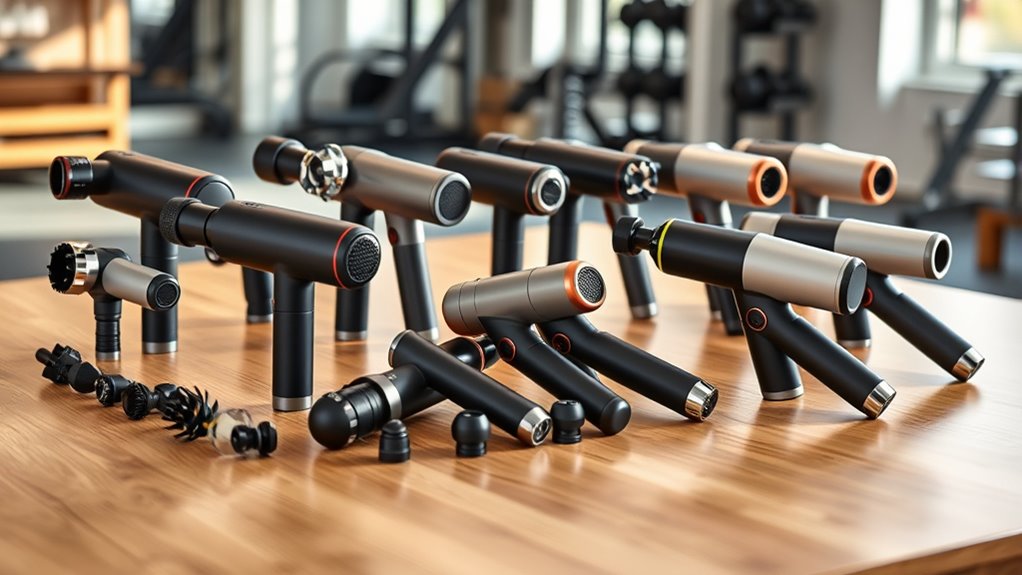 Choosing the right massage gun involves considering its speed and intensity levels, as these features directly impact how effectively you can customize your recovery. Many models offer 20 to 30 adjustable speed and intensity options, allowing you to tailor the massage to your needs. Higher RPM settings, like 3200 rpm or more, deliver deeper tissue penetration for intense relief, while lower speeds provide gentle relaxation. Adjustable controls help target specific muscle groups and accommodate varying pain thresholds or sensitivities. Some guns even feature rapid speed changes, enabling seamless switches between light and deep massage modes during a session. This versatility ensures you can customize your recovery experience, whether you need soothing relief or vigorous deep tissue therapy.