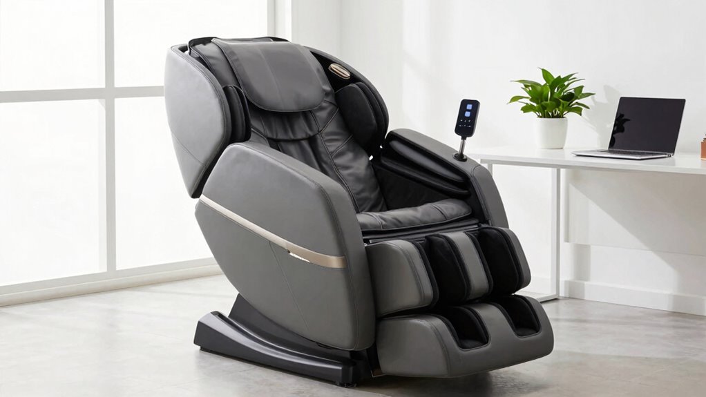 Adjustability features are essential because they allow me to customize the recliner to fit my body perfectly and enhance my comfort during breaks. I look for chairs with adjustable recline angles, usually from 90° to 160°, so I can find the perfect position whether I want to sit upright or lounge flat. Multiple adjustable features like headrests, lumbar support, armrests, and footrests help me tailor the chair to my ergonomic needs, reducing strain. I also appreciate remote controls or control panels that let me easily switch massage modes, intensities, and recline positions without interrupting relaxation. Some chairs offer infinite tilting options, smoothly shifting between sitting, lounging, and lying flat, while height and seat depth adjustments ensure proper posture, making longer breaks more comfortable.