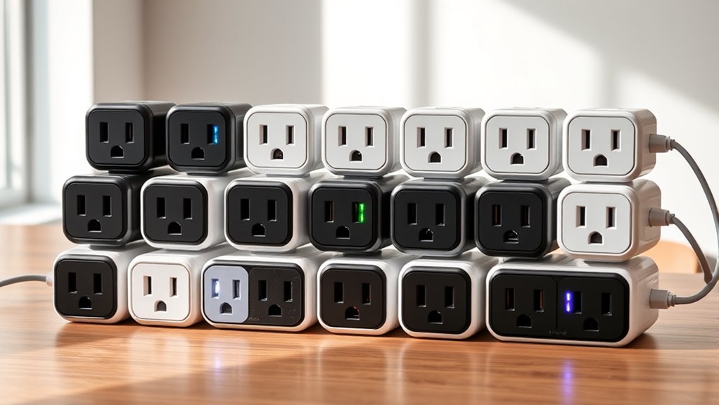 When selecting Matter-compatible smart plug multi-packs, considering their design and space-saving features is essential to making the most of your outlets. A compact design prevents blocking adjacent outlets, allowing you to maximize available space. Look for slim, stackable, or low-profile plugs that fit comfortably into standard sockets without crowding. The size and shape directly impact how many devices you can connect without overcrowding your power strip or outlet. A well-designed smart plug minimizes protrusion, keeping your setup neat and organized. Space-saving models often feature vertical or flat profiles, ensuring they fit comfortably while still offering enough room for multiple devices. Prioritizing thoughtful design helps create a streamlined, clutter-free smart home environment.