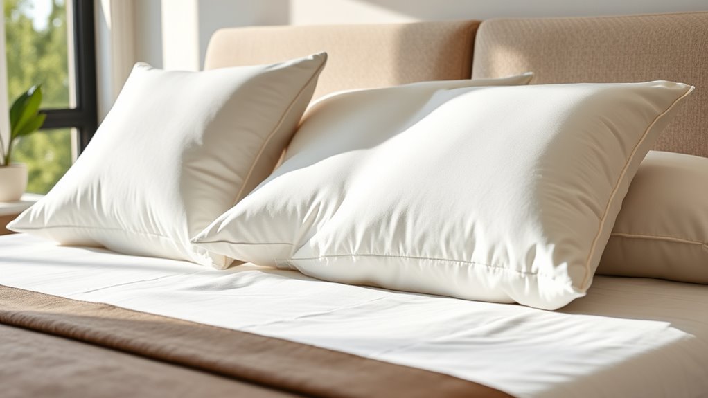 Temperature regulation is essential for a comfortable night’s sleep, especially since memory foam tends to trap heat. To stay cool, look for pillows with cooling features like gel infusion, ventilated designs, or phase change materials that help dissipate heat effectively. Shredded memory foam and breathable covers boost airflow, keeping the surface cool all night. Dual-sided covers made from fabrics like ice silk or bamboo viscose offer instant relief from heat buildup. Adjustable fill options let you customize loft and firmness, reducing pressure and improving airflow to prevent overheating. Certifications like OEKO-TEX or high-resilience foam assure materials meet safety standards and support ideal temperature regulation. Prioritizing these features helps ensure your pillow keeps you cool and comfortable throughout the night.