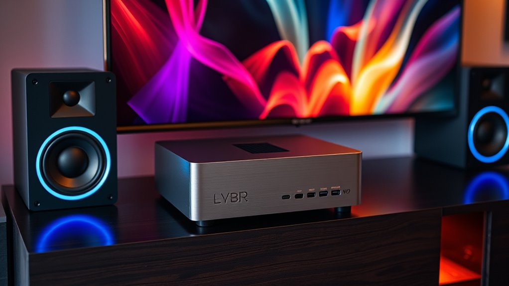 Have you ever considered how noise levels from a mini PC might impact your home theater experience? If your mini PC has an active cooling fan, it could produce noise between 20 to 40 decibels, which might be noticeable during quiet scenes. Fanless models operate at around 10 decibels or lower, making them ideal for silent environments. However, systems with multiple fans or larger cooling solutions can increase noise, potentially disrupting your audio clarity. Some mini PCs come with noise-dampening features like rubber mounts or sound-insulating enclosures, helping keep noise levels down. For a truly immersive experience, choosing a quiet mini PC is essential to prevent audio interference and ensure your home theater remains peaceful and enjoyable.