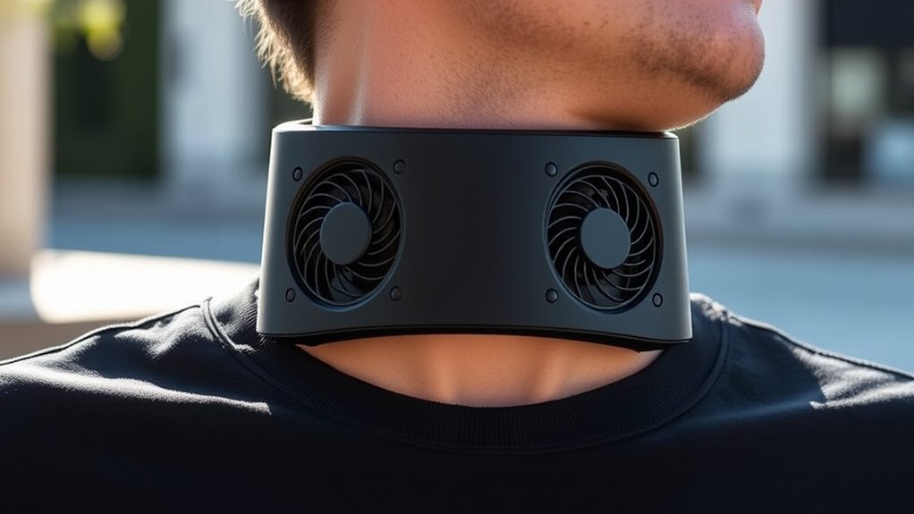 Imagine a gentle breeze whispering through a peaceful forest—that’s how bladeless neck fans feel. Yes, they’re safer for prolonged use because they eliminate exposed blades, reducing injury risk. I find them more comfortable and worry less about accidents, especially during long wear. Their smooth design makes them feel like a calming wind, allowing me to enjoy cooling without concern. They’re a smart choice for safe, continuous comfort.
