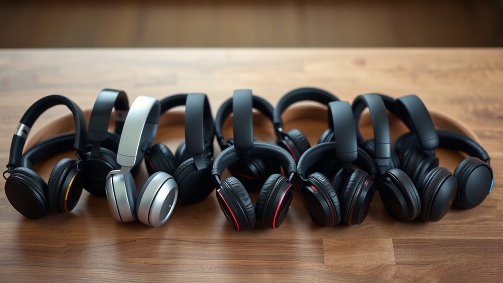 Choosing headphones with effective noise cancellation means paying close attention to how well they block out external sounds. High-quality models can reduce up to 95% of ambient noise, making your listening experience more immersive. Hybrid noise cancellation, which uses multiple microphones and advanced algorithms, generally outperforms single-mic systems, providing better noise reduction. The frequency range over which noise cancellation works—particularly low and mid frequencies—significantly affects performance, especially in noisy environments. Headphones with higher ported noise reduction ratings (NRR) tend to be more effective at suppressing environmental sounds. Additionally, features like transparency or ambient modes can influence how well noise cancellation feels, allowing some external sounds to pass through for safety or awareness. Prioritizing these factors guarantees you get the best noise cancellation within your budget.