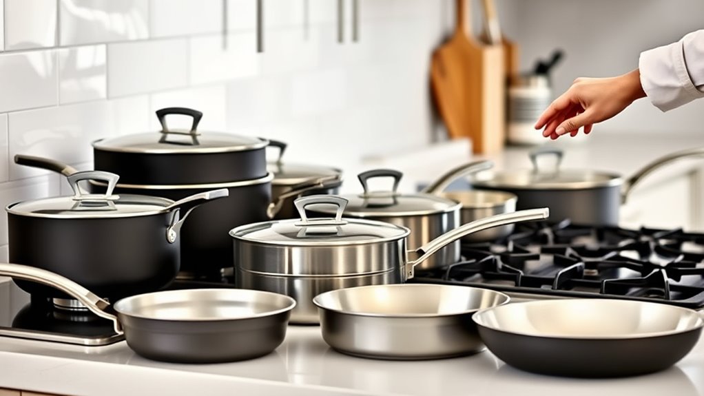 When it comes to non-stick cookware, handle comfort and safety are just as important as performance. I look for handles that stay cool during cooking, like riveted or silicone-coated ones, to prevent burns. Ergonomic designs are a must, especially if I’ll be lifting pots often, as they provide a comfortable grip. I also check that handles are securely attached and made from heat-resistant materials like silicone or Bakelite, so they don’t loosen or melt. Non-slip surfaces are a bonus, giving me better control when stirring or lifting. Additionally, well-designed handles with balanced weight distribution help reduce strain and improve safety. Prioritizing these features guarantees a safer, more comfortable cooking experience, making non-stick sets not just efficient but also user-friendly.