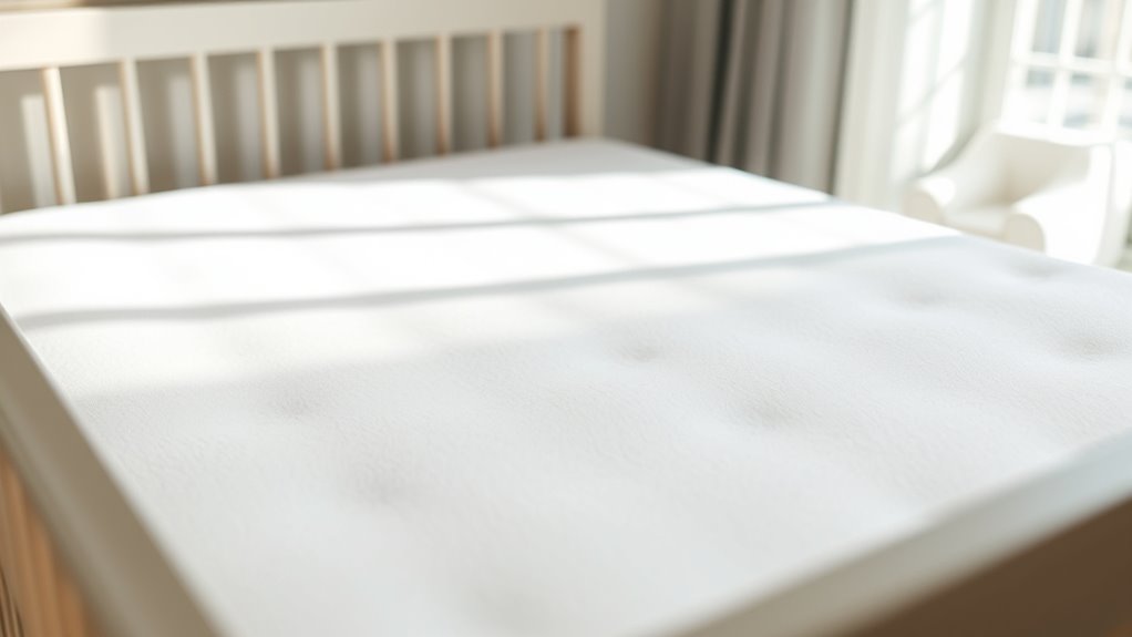 Choosing a crib mattress with trusted organic certification guarantees it meets strict standards for safety and environmental responsibility. Certifications like GOTS and CertiPUR-US set rigorous criteria, ensuring the materials are free from harmful chemicals, pesticides, and synthetic additives. The certification process verifies that every stage of manufacturing, from raw materials to the finished product, adheres to strict safety and environmental protocols. Certified organic mattresses must use organically grown cotton and natural fibers, free from toxic dyes, fertilizers, and synthetic pesticides. Achieving standards such as UL or GREENGUARD Gold indicates low chemical emissions, which helps improve indoor air quality and reduces respiratory risks. Regular audits and testing confirm these standards are maintained, providing peace of mind that the mattress remains free from flame retardants, heavy metals, phthalates, and VOCs.