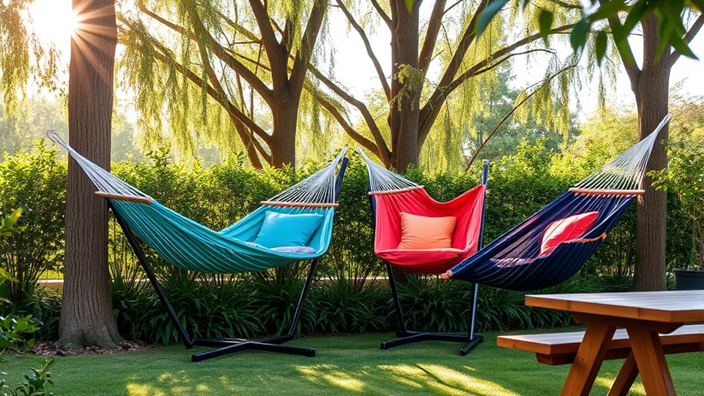 When selecting an outdoor hammock with a stand, considering how easy it is to move and store can make a big difference in your overall experience. Lightweight materials and foldable frames make transportation effortless, so you can take your hammock anywhere. Compact designs and included carrying bags simplify storage and quick setup, whether indoors or outdoors. Disassembly features allow you to pack the hammock and stand separately, reducing bulk and making it easier to store in small spaces. Weather-resistant components help protect your hammock during extended storage periods, preventing damage from the elements. Additionally, hardware that’s easy to assemble and tool-free setup options mean you can break down and reassemble your hammock quickly, making it perfect for spontaneous relaxation sessions wherever you go.