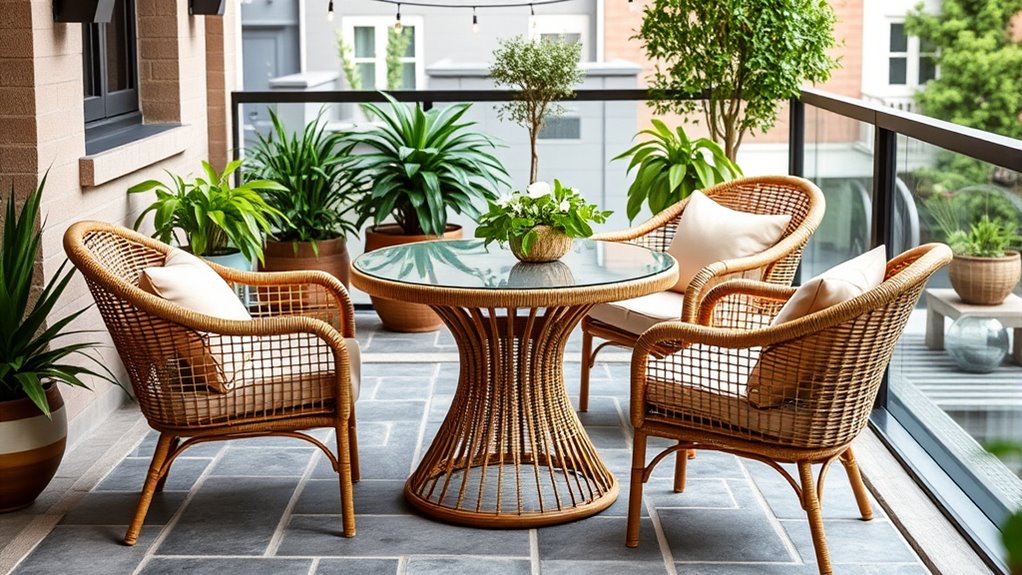 Weather-resistant materials are my go-to for small patios, and I swear they’re like armor for your furniture. Teak, aluminum, and resin wicker are my top picks—they withstand rain, sun, and wind without a fuss. I always look for powder-coated finishes on aluminum or synthetic rattan, which resist corrosion and fading. Choosing these materials means your furniture stays beautiful and functional, no matter what Mother Nature throws your way.