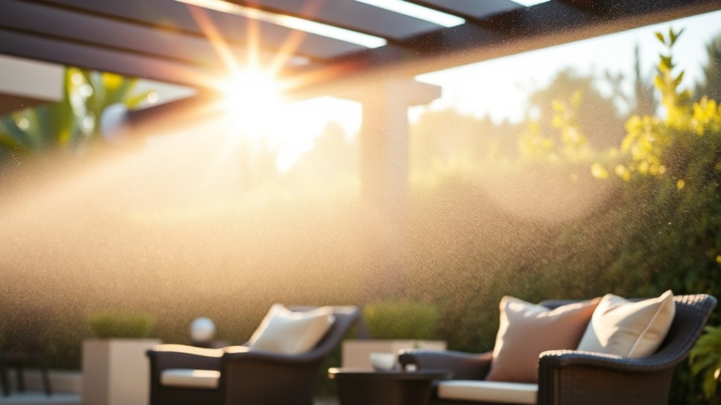 Did you know that outdoor misting systems can lower temperatures by up to 20°F? I believe they’re generally safe around children and pets when used properly. I always guarantee the misting nozzles are positioned away from direct contact zones and supervise kids during use. It’s essential to choose systems with non-toxic, pet-safe materials and follow manufacturer instructions to keep everyone safe while enjoying cool, revitalizing air outside.