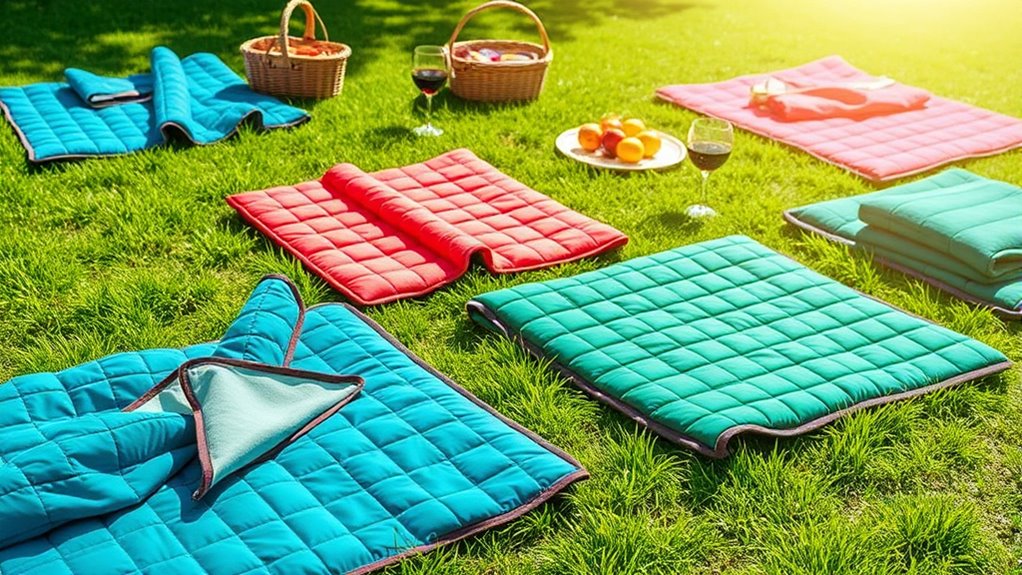 Selecting a picnic blanket that can withstand varying weather conditions helps guarantee your outdoor outings are enjoyable regardless of the forecast. To do this, look for blankets with a sturdy, moisture-resistant backing like PEVA, Oxford, or polyester, which prevent water from seeping through damp ground or wet surfaces. The top layer should feature water-repellent materials such as polyester or nylon to resist rain and spills. Multi-layer designs that include waterproof and sandproof layers offer added protection against moisture, sand, and dirt. Additionally, sealed or coated seams are essential—they stop water from penetrating through stitching during heavy rain or damp conditions. Make sure the blanket’s waterproof features are tested and rated for specific weather scenarios to ensure reliable outdoor performance.