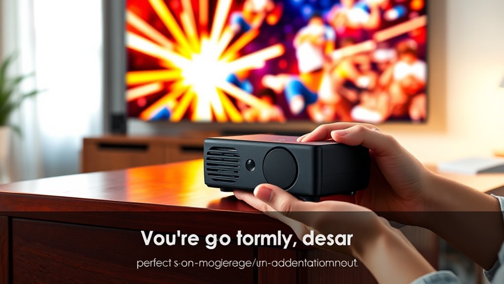 Choosing a pocket-sized mini projector depends heavily on its brightness and clarity, as these factors determine how well you can see your content in different environments. Brightness, measured in lumens, is essential—higher lumens mean brighter images, which are vital in well-lit spaces. Clarity hinges on resolution; 1080P offers sharper, more detailed images than lower resolutions like 720P or 480P. Contrast ratio also plays a role, with higher ratios producing more vibrant colors and better depth. Ambient light impacts visibility considerably—darker rooms improve image clarity more than bright ones. Additionally, technologies like DLP or LCD ensure consistent brightness and sharpness across the screen. Ultimately, balancing brightness and clarity ensures your viewing experience remains crisp and vivid, no matter where you watch.