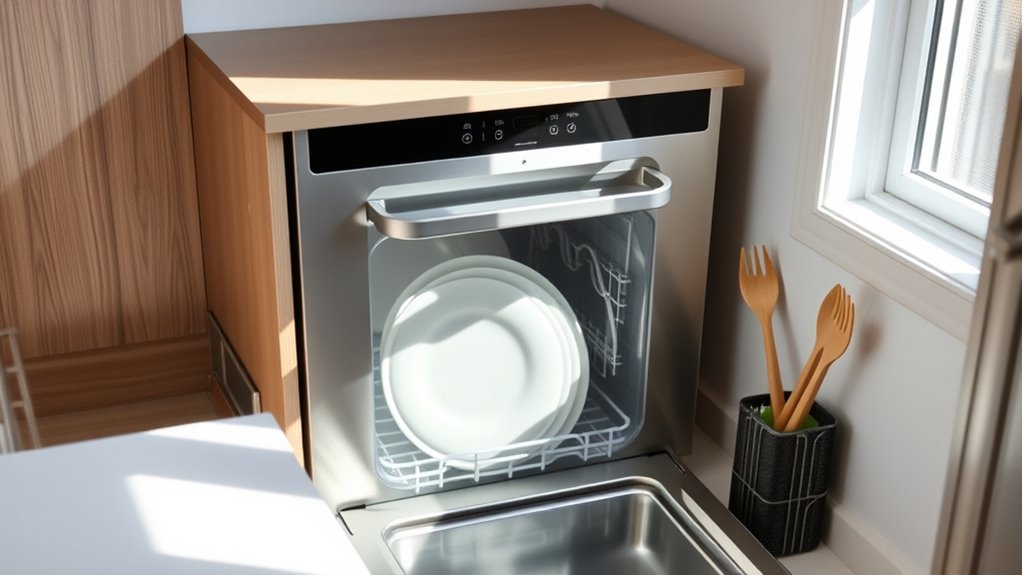 Effective drying and odor control are essential when choosing a portable dishwasher for a small apartment, as lingering moisture can lead to mold and unpleasant smells. Look for models with effective drying features like hot air drying and automatic venting, which help remove residual moisture. Some dishwashers include ventilation cycles lasting up to 72 hours, continuously circulating air to eliminate damp odors. High-temperature cleaning cycles around 167°F can sanitize dishes and reduce bacteria that cause smells. Immediately drying dishes after cycles and keeping the interior dry are also critical to preventing mold and mildew. Additionally, a built-in odor filtration system can help maintain a fresh kitchen environment. Prioritizing these features ensures your dishes stay clean, dry, and free from musty odors.