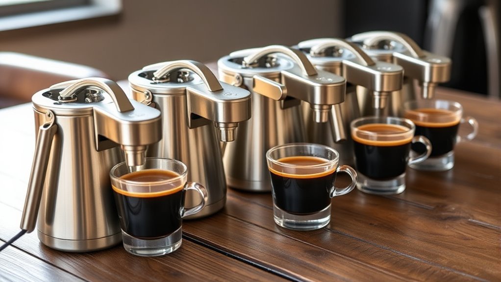 Choosing the right portable espresso maker involves considering which coffee types it supports, as this directly impacts convenience and flavor. Some machines work with ground coffee, while others use capsules or pods, offering flexibility for different preferences. Many models are compatible with multiple capsule brands like Nespresso or DolceGusto, giving you more options when traveling. The brewing process can vary depending on the coffee format, with some machines supporting both capsules and ground coffee for added versatility. Coffee type options influence not only flavor and crema quality but also brewing time, which is vital for quick, on-the-go mornings. Keep in mind that not all portable espresso makers support every coffee format, so choosing one aligned with your preferred coffee type ensures maximum use and satisfaction.