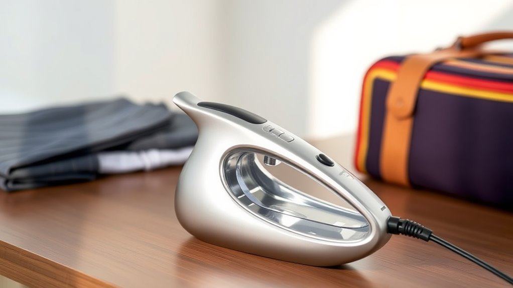 Safety features are vital considerations when selecting a portable garment steamer, especially for travel. Auto shut-off and overheat protection are indispensable, preventing accidents and damage if the steamer is left on or overheats. Leak-proof technology, like anti-drip designs, ensures water stays inside, reducing the risk of spills and stains on clothing. Heat-resistant materials and safety soles help prevent burns when handling or adjusting the steamer. Adjustable temperature settings allow me to choose the right heat level for different fabrics, minimizing scorching. Ergonomic handles and rotatable heads improve control, making operation safer and easier. These features give me peace of mind, knowing I can safely and confidently use my steamer wherever I go, without worrying about mishaps or damage.