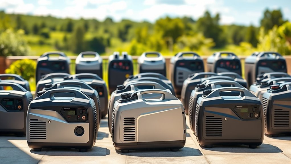 Imagine camping peacefully when a generator suddenly disrupts your quiet—noise levels really vary among models. For example, a compact inverter generator might run at 50-60 decibels, similar to a conversation, while larger portable units could reach 70-80 decibels, akin to a lawnmower. I recommend checking decibel ratings before buying; quieter models make outdoor adventures more enjoyable and less disruptive for everyone around you.