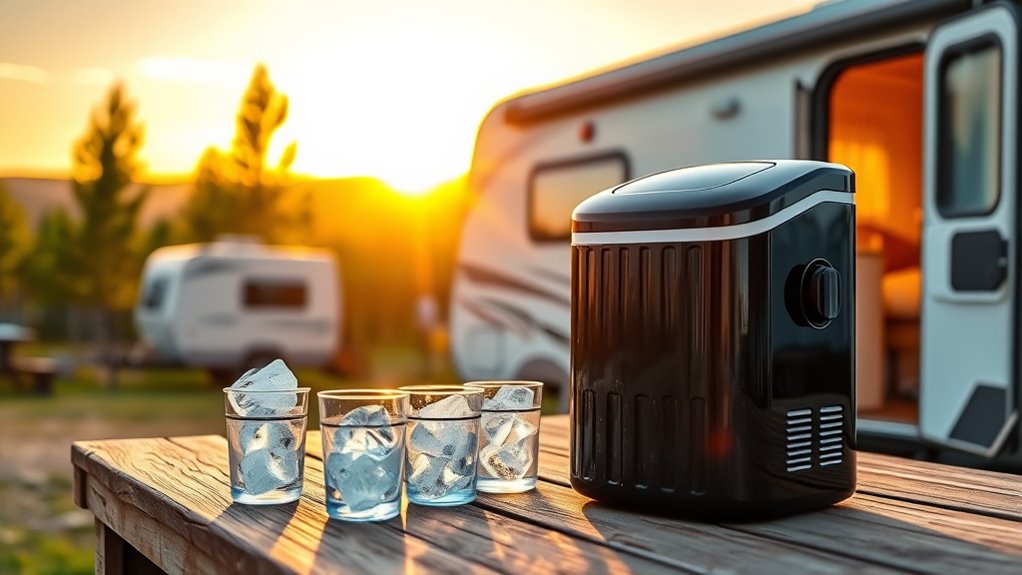 Fast ice production is essential for RV owners who want to keep beverages cold and stay prepared during their trips. Ideally, a portable ice maker should produce a batch of ice within 6 to 8 minutes, so you’re never waiting long for fresh supplies. Models with high daily output, around 26-34 pounds, ensure you have enough ice for gatherings or extended travel days. Shorter cycle times mean more frequent ice production, reducing delays and keeping your drinks chilled. Efficiency is key—some machines can make multiple batches per hour, providing a continuous supply without interruption. This rapid production capability makes a big difference when hosting outdoor meals or needing quick ice during spontaneous moments on the road. Ultimately, faster ice-making helps you stay cool and well-prepared wherever your adventures take you.