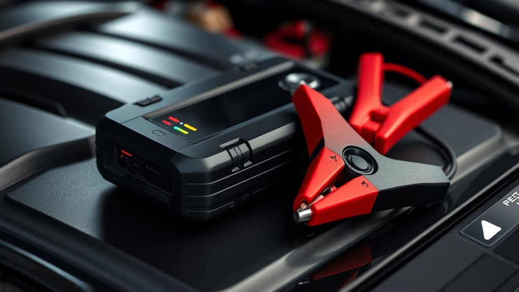 Lithium-ion batteries dominate the market for portable jump starters because they pack a high energy density into a lightweight and compact design. This makes them ideal for easy portability without sacrificing power. Lithium-polymer batteries offer similar benefits but can be shaped into more flexible forms, making storage even more convenient. Lead-acid batteries, while bulkier and heavier, tend to last longer and perform better in cold weather, which can be vital in certain climates. When choosing a jump starter, it’s important to consider the battery’s capacity, measured in milliamp-hours (mAh) or watt-hours (Wh), to guarantee it can handle multiple charges or jumps. Advanced battery management systems (BMS) are also essential for lithium batteries, providing safety by preventing overcharging, overheating, and thermal risks.