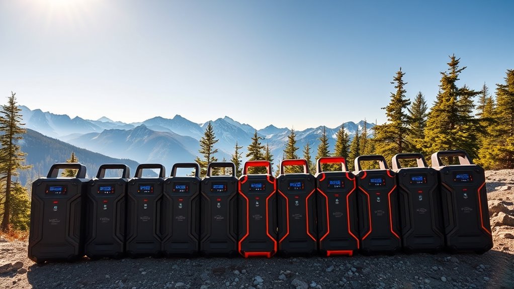 Selecting a portable power station involves balancing capacity with ease of transport. Lighter models, often under 10 pounds, are ideal for outdoor trips or emergencies because they’re simple to carry. The size also matters; compact units around 6-12 inches make travel more convenient. Features like handles, wheels, and built-in drawbars boost mobility, especially for larger, higher-capacity units. Still, increasing watt-hour capacity usually adds weight, so finding the right balance is key. Consider whether the design includes foldable handles or ergonomic grips, which can considerably improve portability. Ultimately, I look for a model that offers enough power without sacrificing portability, ensuring I can easily take it wherever I go without feeling weighed down.