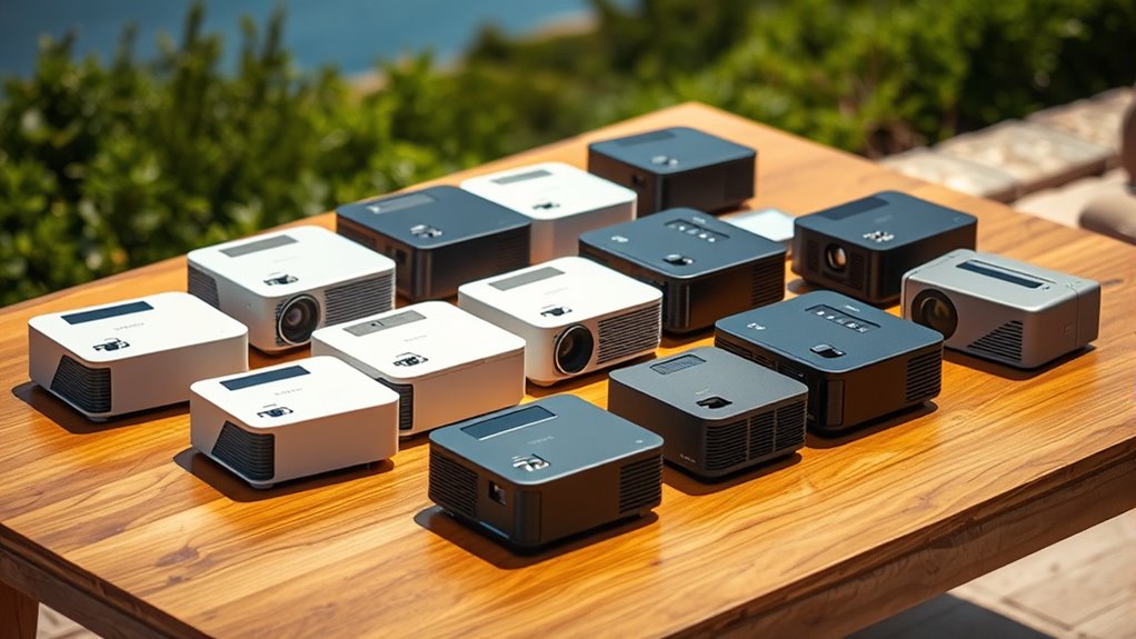 If you’re looking for the best portable projectors for travel, I recommend models that balance size, ease of setup, and picture quality. Think about options like mini 4K WiFi projectors with Bluetooth, auto keystone, and large screens for outdoor adventures. Some standout choices include the JY360, Aurzen ZIP, and XGIMI MoGo 4 with a convenient PowerBase. Keep an eye on battery life, connectivity, and screen size—there’s plenty to explore if you continue.