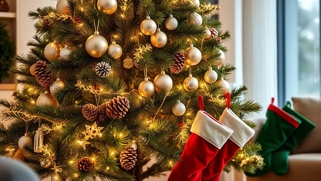 Achieving a realistic look with your pre-lit Christmas tree starts with paying attention to its tips and overall profile. Look for trees with over 1,800 tips to create a dense, lifelike appearance. Opt for trees with handcrafted or Feel Real tips, which mimic natural branches and add authenticity. Consider trees with hinged branches that can be easily fluffed and shaped, enhancing fullness and realism. Evaluate the materials used—crush-resistant polyethylene and flame-retardant PVC ensure durability and safety. Also, focus on the branch density and profile; wider, full-bodied trees better resemble real evergreen conifers. These factors combined help you select a tree that not only looks authentic but also provides a sturdy, beautiful foundation for your holiday decorations.
