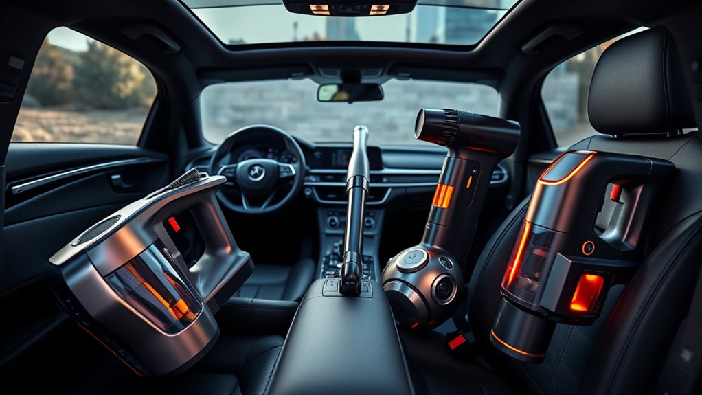 When choosing a premium car vacuum, I look for versatile attachments that make cleaning more efficient and thorough. Tools like crevice tools, dusting brushes, and pet hair removers help me tackle tight spaces, upholstery, and hard-to-reach areas with ease. Having multiple nozzles and extensions allows me to customize my cleaning, ensuring I can remove debris from carpets, seats, vents, and dashboards effectively. High-quality vacuums often include specialized tools such as inflatable nozzles or flexible hoses, which expand their capabilities to tasks like inflating or blowing debris away. Washable and reusable attachments not only save money but also make maintenance simple. Overall, a variety of attachments boosts a vacuum’s versatility, letting me clean multiple surfaces and materials without needing additional equipment.