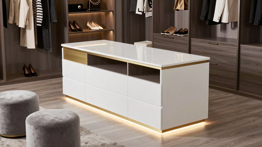 Lighting and display features can considerably enhance both the functionality and visual appeal of your closet island. Integrated LED lighting improves visibility, making it easier to find items while highlighting your accessories or jewelry. RGB LED lights, which can be controlled remotely, let you customize the ambiance to suit your mood or decor. Glass surfaces, shelves, and tops allow for clear displays of decorative pieces and accessories, creating a sleek, modern look. Transparent or glass panels in drawers and shelves enable quick identification of stored items without opening compartments. Proper lighting not only elevates the aesthetic but also reduces clutter by helping you locate specific items swiftly. Overall, thoughtful lighting and display options make your closet both more attractive and more efficient.