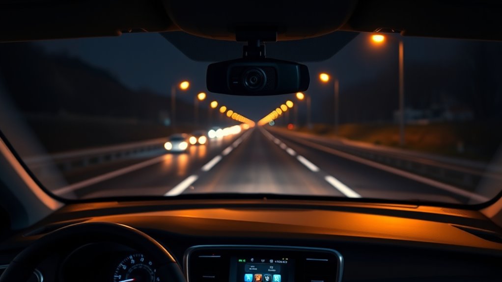 Achieving clear night vision in dash cameras depends on several critical factors. First, large image sensors like STARVIS 2 or IMX335 boost low-light sensitivity, capturing brighter, more detailed images. Infrared LED lights and WDR technology further enhance visibility, reducing glare and balancing light extremes. Larger apertures, such as F1.5 or F1.8, allow more light into the sensor, resulting in brighter footage after dark. Advanced features like six-layer lenses and IR illumination help clearly capture license plates, pedestrians, and road signs at night. Proper calibration of night vision technology guarantees minimal noise and glare, delivering sharper footage. When selecting a dash camera, prioritize these elements to ensure peak night vision clarity, providing peace of mind and safer driving during nighttime hours.