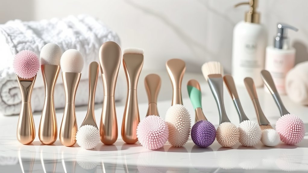 Ever wondered how the right brush head can make a difference in your skincare routine? Choosing the right type depends on your skin’s needs. Tapered bristles and flat-ended exfoliating brushes target deep cleansing and dead skin removal, while silicone heads offer gentle massage and are perfect for sensitive skin. Interchangeable heads give you flexibility, allowing you to customize the intensity—whether for thorough pore cleaning or daily refreshment. The material and design also matter; silicone tends to be more durable and easier to clean, whereas nylon bristles can provide a more rigorous scrub. Additionally, the size, shape, and texture of the brush head influence coverage, comfort, and effectiveness across different facial zones. Picking the right options guarantees your routine is both effective and comfortable.
