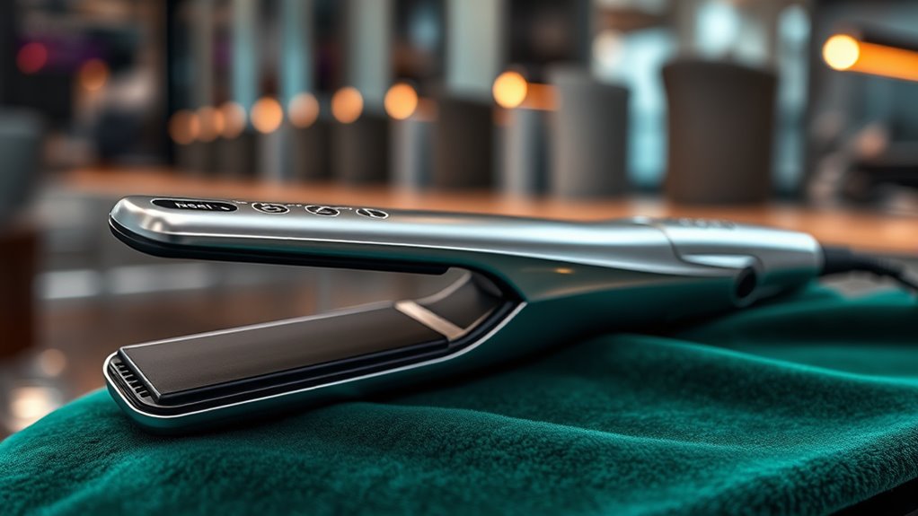 Having precise heat settings is essential because they directly influence how well your hair responds to styling without unnecessary damage. Premium straighteners typically offer adjustable temperatures from 250°F to 450°F, allowing customization for different hair types and styles. Digital displays or dials give you full control, so you can set the perfect heat level, reducing the risk of heat damage. Fast heat-up times, often just 3-5 seconds, make styling quick and convenient. Some models include intelligent sensors that maintain a consistent temperature, ensuring even results and preventing thermal fluctuations. The ability to select specific heat settings helps tailor your styling approach, whether for delicate, fine hair or thick, coarse strands, optimizing both safety and effectiveness.