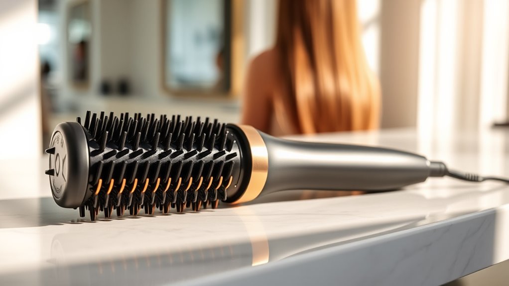 When selecting a premium hair straightening brush, paying attention to its ease of use can make a big difference in your styling experience. An ergonomic handle with intuitive button placement improves grip and reduces fatigue, so you can style comfortably for longer periods. Lightweight designs under 1 pound make maneuvering effortless and minimize arm strain. Adjustable temperature ranges allow you to customize settings for your hair type, ensuring effective and safe styling. Clear digital displays provide precise temperature readings, giving you control and consistency. Safety features like cool tips, anti-scald design, and auto shut-off boost confidence and prevent accidents. Overall, a well-designed, user-friendly brush makes styling quicker, safer, and more enjoyable—bringing salon-quality results right into your home.