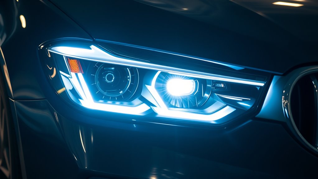 Brightness and lumens are crucial factors to contemplate when upgrading to premium LED headlights because they directly impact visibility and safety on the road. Higher lumen ratings usually mean brighter headlights, with premium LEDs often exceeding 10,000 lumens per bulb for maximum brightness. The ideal range for high-performance headlights typically falls between 30,000 and 100,000 lumens per pair, depending on your vehicle and driving needs. However, more lumens aren’t always better—excessively high levels can cause glare and discomfort for oncoming drivers. It’s important to balance brightness with proper beam focus and pattern, as lumens alone don’t guarantee effective lighting. Considering these factors ensures you get a headlight upgrade that enhances visibility without compromising safety.