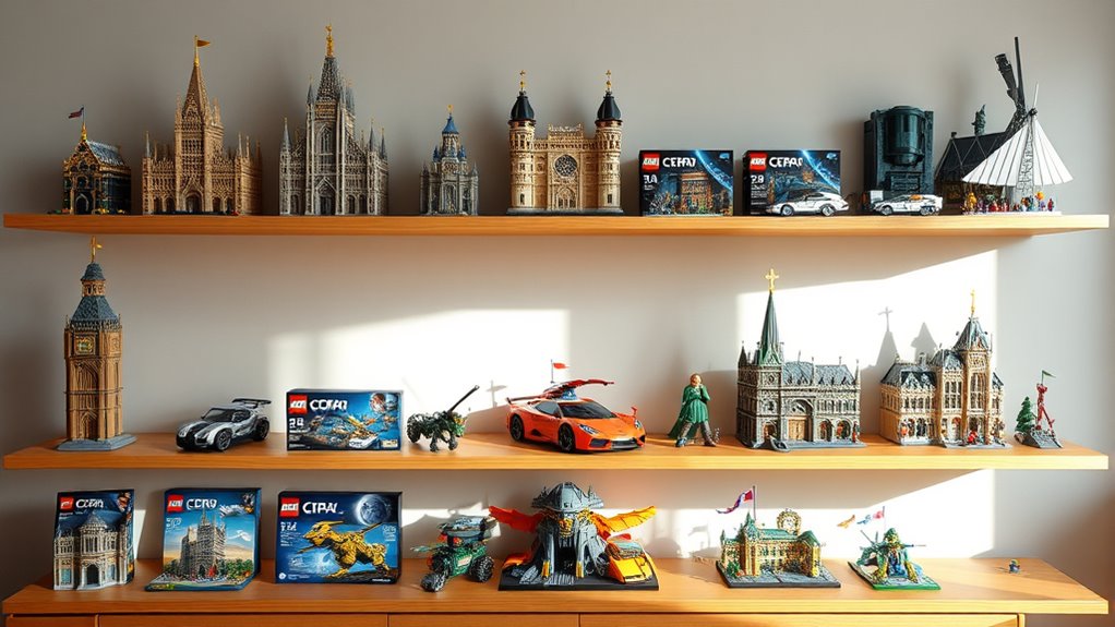 To preserve my collectible LEGO sets, I keep them in a cool, dry place away from sunlight, which can fade colors. I also handle them with clean hands and avoid unnecessary touching to prevent wear. Using display cases with UV protection helps shield them from dust and damage. Regularly cleaning with a soft brush keeps dust off, ensuring they stay pristine and looking their best for years to come.