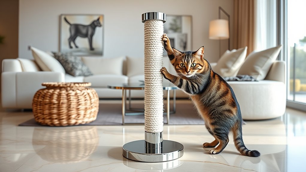 Looking for the best premium luxury cat scratching posts that blend style and function? I’ve found top options crafted from durable materials like sisal rope, engineered wood, and eco-friendly fibers that last. They feature sleek, modern designs and come with fun toys and multiple levels for climbing and stretching. These posts are stable, safe, and easy to assemble—perfect for active cats and stylish homes alike. Stay tuned to discover more about these stylish, functional solutions.
