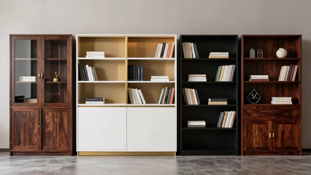 Absolutely, these bookshelves can be tailored to fit your office’s personality like a bespoke suit. I’ve seen custom finishes, unique wood grains, and personalized hardware transform a standard piece into an extension of your style. Whether you prefer sleek modern lines or vintage charm, the options are endless. Customization allows your bookshelf to become a harmonious part of your decor, making your workspace truly yours.