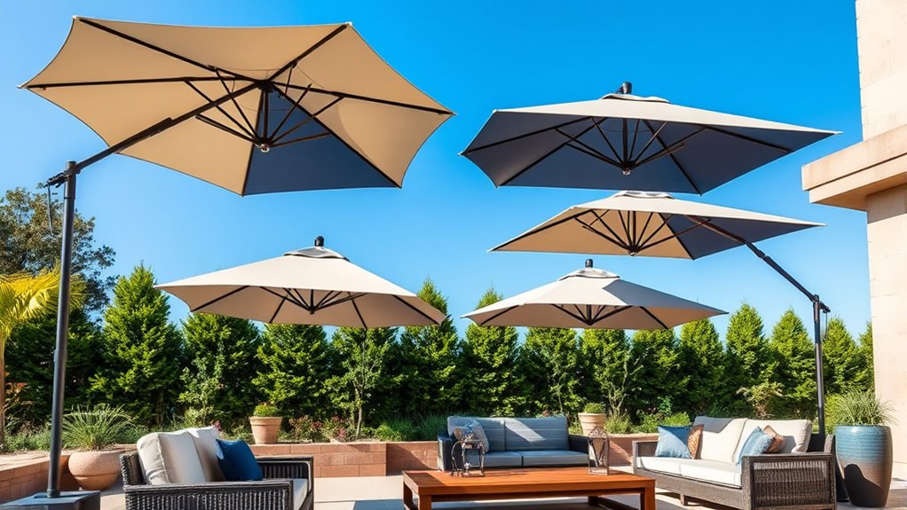 I’ve found the top 14 premium patio umbrellas that beautifully blend style with durability. These options feature sturdy frames made from materials like aluminum and hardwood, combined with fade-resistant fabrics such as Sunbrella and solution-dyed Olefin, ensuring they withstand the elements. Many come with easy-to-operate tilting and cranking mechanisms, along with stable bases with wheels for portability. Keep exploring to discover more details about these stylish, weather-resistant umbrellas that can elevate your outdoor space.
