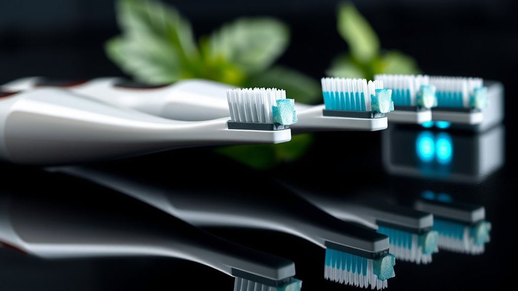 Technological features play a vital role in maximizing the effectiveness of premium whitening toothbrush systems. Blue light technology, usually at 460nm, activates whitening agents in toothpaste or gels, boosting stain removal during brushing. High-frequency vibrations, over 30,000 strokes per minute, help lift surface stains and provide a deeper clean for brighter teeth. Multiple cleaning modes, including dedicated whitening settings, enable customization to target specific stains or polish enamel effectively. Smart sensors and timers guarantee you brush for the most suitable duration and apply the right pressure, which enhances whitening results while protecting gums and enamel. Some advanced systems even incorporate AI or zone-based tracking, guaranteeing thorough coverage and reducing missed spots. These technological features work together to deliver superior whitening and oral health benefits.