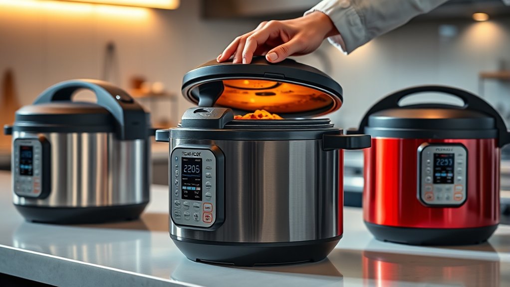 I believe electric pressure cookers are safer than stovetop models because they come with built-in safety features like pressure release valves and automatic shut-offs. They’re more manageable and minimize risks of overpressure or accidents. Stovetop models require more attention and manual control, which can be tricky. So, if safety’s a priority, electric cookers definitely offer peace of mind and practical ease.