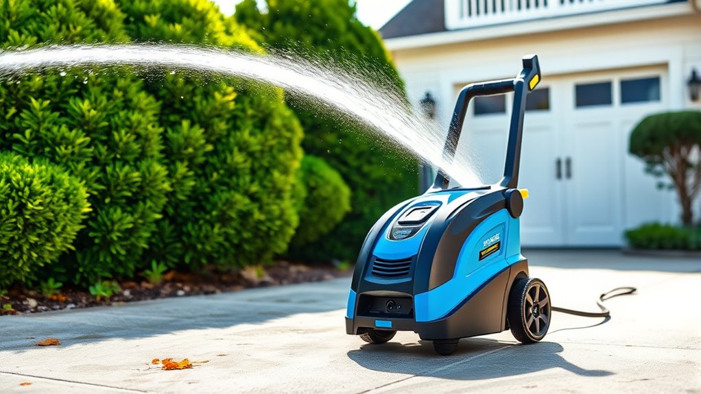 Safety features are vital when selecting a 2000 PSI electric pressure washer because they help prevent accidents and guarantee reliable operation. Look for models with automatic pump shut-off systems like the Total Stop System (TSS), which turn off the motor when not in use, preventing overheating and saving energy. Safety locks on the spray gun are essential to avoid accidental spraying during operation. Built-in thermal overload protection automatically shuts down the motor if it overheats, protecting the device. Confirm the hose connections and nozzles are sturdy, leak-proof, and lock securely to prevent leaks and spray mishaps. Additionally, choose models that include clear safety instructions and warning labels, promoting proper handling and reducing the risk of injury during use.