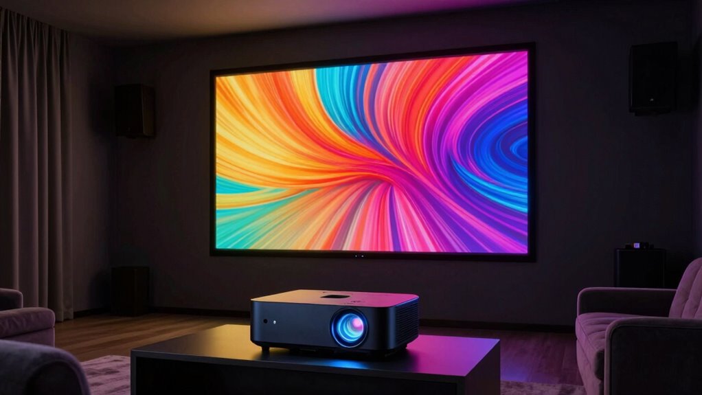 When choosing a projector under $500, I look at several key factors to guarantee it meets my needs. Brightness, resolution, portability, connectivity options, and smart features all play a role in making the right choice. Understanding these points helps me find a projector that balances performance and convenience.