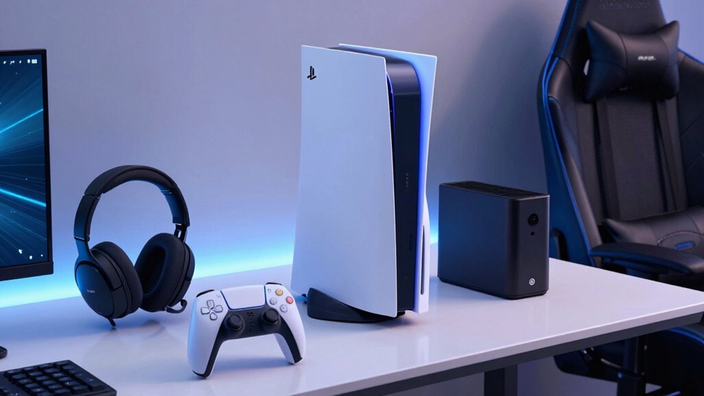 Performance and speed are critical factors that can make or break your gaming experience on the PS5. Fast-charging controllers reduce downtime, letting me jump back into play in under three hours, keeping the momentum going. Performance-enhancing accessories like thumbstick grips and rings improve my accuracy and response time, giving me an edge in competitive matches. Efficient data transfer hubs streamline game updates and transfers, saving valuable gaming time and keeping my system running smoothly. Cooling accessories with adjustable fans help maintain ideal performance by preventing thermal throttling, ensuring my console stays responsive during intense sessions. Finally, low-latency wireless accessories, such as headsets and controllers, deliver real-time audio and input, which is essential for immersive and competitive gameplay. All these factors are crucial for a seamless, high-performance gaming experience.