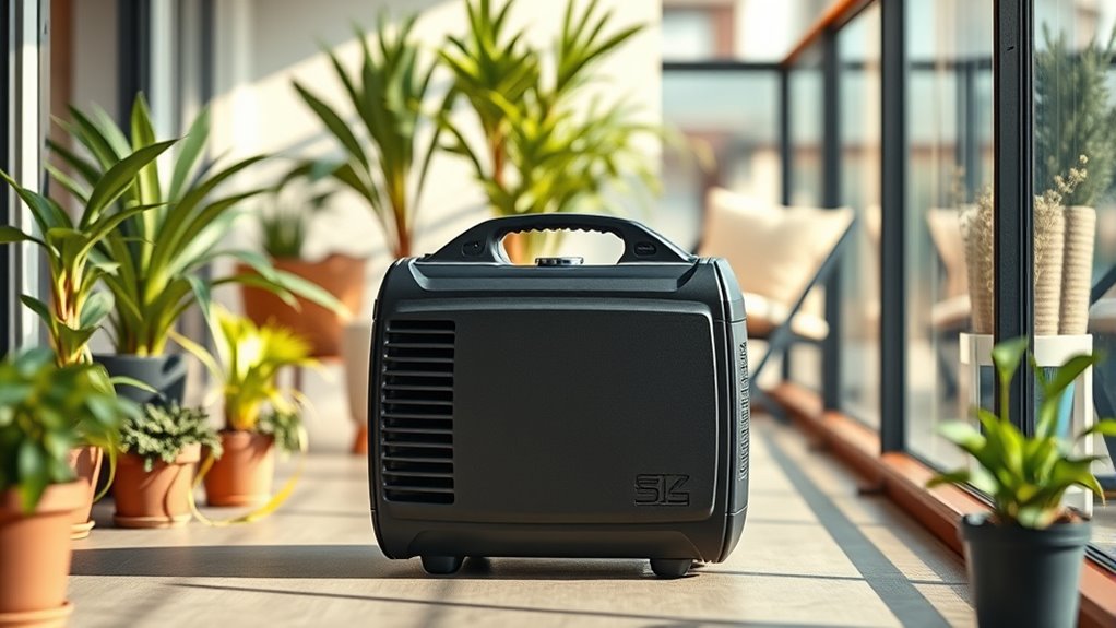 When choosing a portable generator for an apartment, size and space are critical factors that can’t be overlooked. I recommend selecting a compact, lightweight model—ideally under 50 pounds—that easily fits into small storage areas like closets or cabinets. It’s important to measure your available space beforehand to ensure the generator doesn’t block pathways or violate apartment regulations. Look for models with foldable handles or built-in wheels, which make moving and storing them much easier in tight spaces. A low-profile or slim design helps minimize its footprint and keeps your living area looking tidy. Considering these size and space factors guarantees you can store your generator conveniently without clutter or inconvenience, making it a practical addition for apartment living.