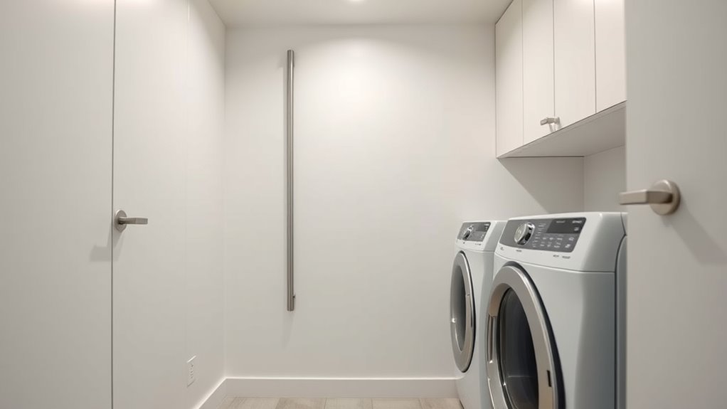 When installing a central vacuum system, selecting the right location is essential to keep noise levels low in your living spaces. I recommend placing the unit in a dedicated, well-ventilated area like a garage, basement, or utility room. This keeps noise away from bedrooms and main living areas. The home’s size and layout influence pipe design and installation complexity; more inlets mean more piping. For small spaces, compact or wall-mounted units are ideal—they take up less room and can be hidden easily. Proper pipe routing is vital; minimizing bends and long runs helps maintain suction and reduces noise amplification. Additionally, installing sound-absorbing materials around the unit and piping can greatly cut down noise transmission, ensuring your home stays peaceful during vacuuming.