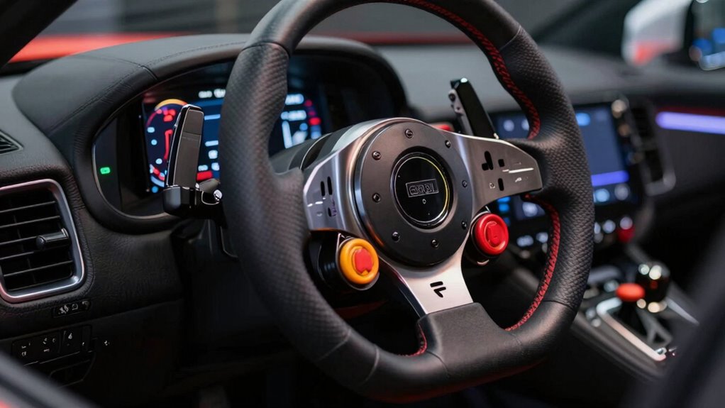 Choosing the right racing wheel involves paying close attention to its size and design, as these factors directly affect your comfort and control during gameplay. Wheel size, measured in inches or centimeters, impacts how natural and immersive your driving feels. Larger wheels often enhance realism but require more space and sturdy mounting. Typically, wheels between 10 to 13 inches strike a good balance between control and comfort for PS5 setups. The design, including shape and material, also matters—ergonomics play a big role in reducing fatigue during long sessions. Some wheels are customizable or interchangeable, allowing you to tweak size and style to match your racing preferences. Picking a wheel that fits your setup and feels comfortable can dramatically improve your overall gaming experience.