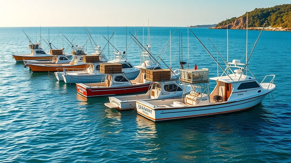 Choosing the right bait capacity is essential for maximizing your fishing efficiency, as it determines how long you can fish without needing a refill. Larger bait tanks, typically holding from 2 to over 6 pounds, allow for extended fishing sessions and reduce downtime. The size of bait compartments influences how much bait you can carry and deploy at once, which is especially important for targeting specific species or performing targeted baiting. Having multiple bait containers can improve catch rates and minimize bait wastage. Generally, bigger boats support larger tanks, offering increased capacity. It’s vital to match the bait capacity with your fishing environment and targeted species, ensuring you have enough bait available without overloading the boat, which could affect maneuverability or stability.