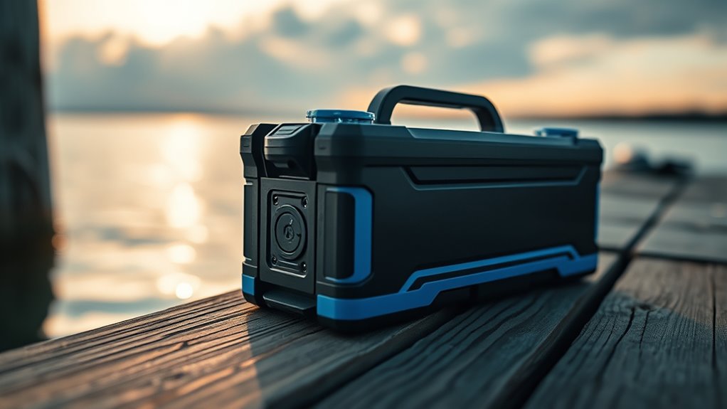 Durability and longevity are vital considerations because a battery that can withstand daily use saves you time and money in the long run. I look for batteries with high-quality lithium-ion or lithium-polymer cells, as they resist wear over many charge cycles. A built-in Battery Management System (BMS) is essential because it protects against over-discharge, over-current, and short circuits, considerably extending the battery’s lifespan. I also prioritize batteries with at least 12000mAh capacity to guarantee longer fishing sessions without frequent recharging. Robust construction is a must—batteries should resist water, dust, and temperature fluctuations, especially for outdoor use. Lastly, I choose batteries with a proven record of supporting hundreds of recharge cycles, maximizing value and durability over time.